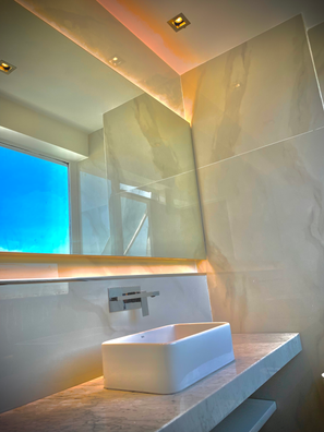Lavabo rectangular: Ubicado sobre una mesada de mármol con vetas grises, el lavabo aporta un toque lujoso. La grifería negra mate empotrada en la pared contrasta con el fondo claro, realzando el estilo contemporáneo.